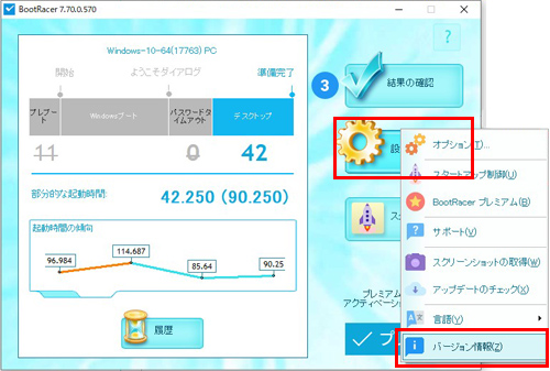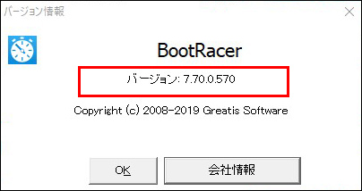 「BootRacer Premium」を起動し「設定」ボタンから「バージョン情報」を選択します。表示された画面内に記載されます。