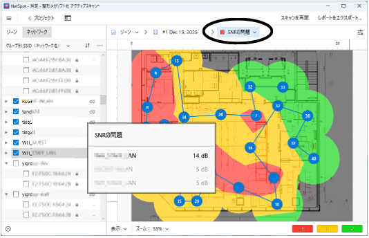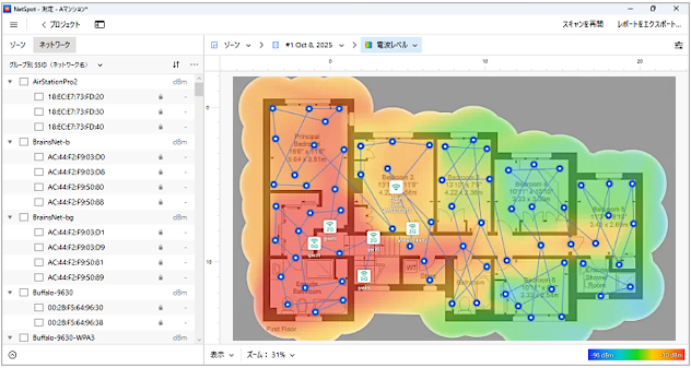 一番の特徴は、調査したい場所を実際に測定し、Wi-Fiヒートマップを簡単に作成できることです。自宅やオフィスなどの図面に、Wi-Fi信号強度のグラフを重ねて表示します。 測定モードで使用される用語については、こちら をご参照ください。