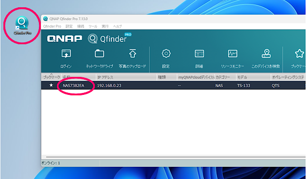 以下は、QNAPのNASを例にご紹介しています。 QNAPのNASは、メーカーサイトから 管理ツール「Qfinder Pro」をダウンロード、インストールしました。該当のNASをダブルクリックすると設定画面が開きます。
