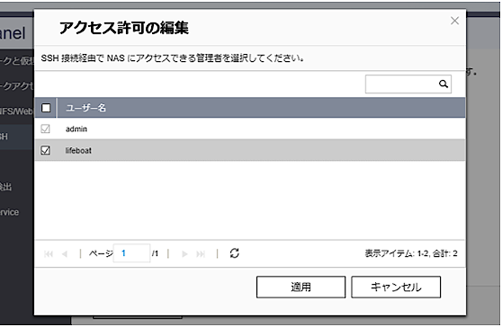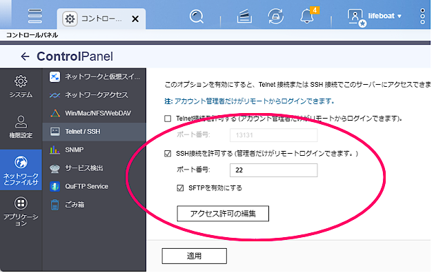 設定画面で SSH接続を許可するにチェックを入れます。(通常はポート22をご利用ください。) 「アクセス許可の編集」をクリックして、アクセス権限を確認します。 ※アクセス権限が付与されているのにDisk Drill で接続を拒否される場合は、NASメーカーの説明書等でSSHの互換性をご確認ください。NASによっては root、admin、sshd等のユーザーでないと接続できないことがあります。(本記事の後半で一例をご紹介しています。)