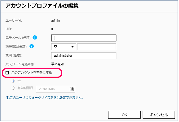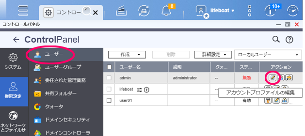接続できると、パーティションやボリュームが表示されます。データを保存していたボリュームを選択して、「消失データの検索」をクリックしてください。 ■アクセス権があるのに接続が拒否される場合(一例) テストしたQNAPのNASでは、管理者権限でWindows上での通常の読み書きは可能でも、Disk Drill ではユーザー名が「admin」でないと接続できませんでした。 このNASの場合は、セキュリティの観点から使用開始の早い段階で、新しい管理者を作成する流れになっており、上記の例では「lifeboat」を作成した時点でデフォルトの「admin」は「無効」になっていました。Disk Drill で使用するには「admin」を有効にする必要があります。