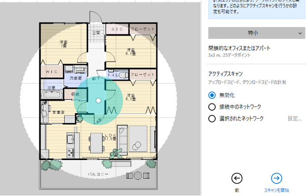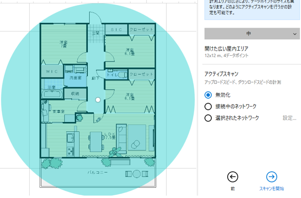 上記はあくまで目安です。 広い空間でも、仕切りや壁が多い場合には 小さめのポイントを選択したほうが正確に測定できます。エリアが広く遮るものがないほど、大きな円を指定できます。
