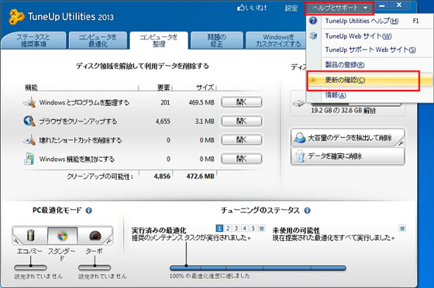 1. TuneUp Utilities を起動し、「ヘルプとサポート」-「更新の確認」をクリックします。