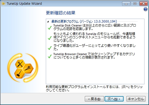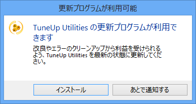 | TuneUp Utilities は、自動で更新プログラムを確認し、更新プログラムがある場合には通知メッセージが表示されるようになっていますが、手動で更新プログラムを確認し、アップデートを行うこともできます。アップデートの手順は以下の通りです。