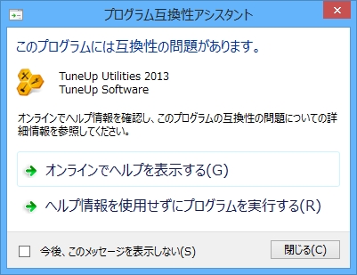 この画面が表示される場合は、Windows Updateを行い、最新の更新プログラムを適用してください。Windows 8.1 用更新プログラム「KB2887595」が適用された環境では、この画面は表示されません。設定で画面を表示させないようにする場合は、「今後、このメッセージを表示しない」にチェックを入れます。「ヘルプ情報を使用せずにプログラムを実行する」をクリックすると、TuneUp Utilities 2013 が起動します。 |